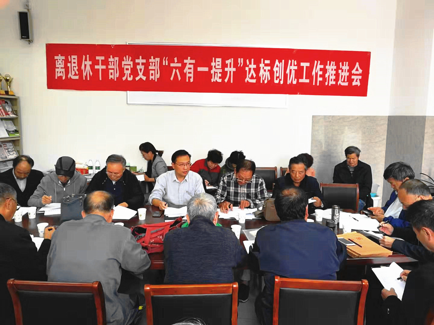 会上,离退休党工委书记、离退休工作处处长黄金虎首先传达了省委老干部局、省委离退休干部工委《关于开展首批离退休干部党支部“六有一提升”达标验收工作的通知》精神,和与会同志们一起回顾复习了省委组织部、省委老干部局、省委离退休干部工委《关于加强和改进离退休干部党组织建设的意见》和《关于印发〈全省离退休干部党支部“六有一提升”达标创优办法〉的通知》两个文件内容,特别是围绕“有党的组织”“有领导班子”“有组织活动”“有作用发挥”“有工作制度”“有工作保障”六个方面情况的达标创优标准,逐条了解各支部工作开展情况,同时要求各党支部和党工委各部负责人根据上级文件精神,按期完成达标任务,并通过开展达标创优活动,着力把离退休党支部建设成为宣传党的主张、贯彻党的决定、参与基层治理、团结动员群众、推动改革发展的坚强战斗堡垒。另外,在本次推进会上,党工委还强调各离退休党支部要按照校党委要求,扎实开展“不忘初心、牢记使命”主题教育。推进会结束后,全体与会同志又分三个组进行了讨论,对工作重点、难点问题进行了深入研究。