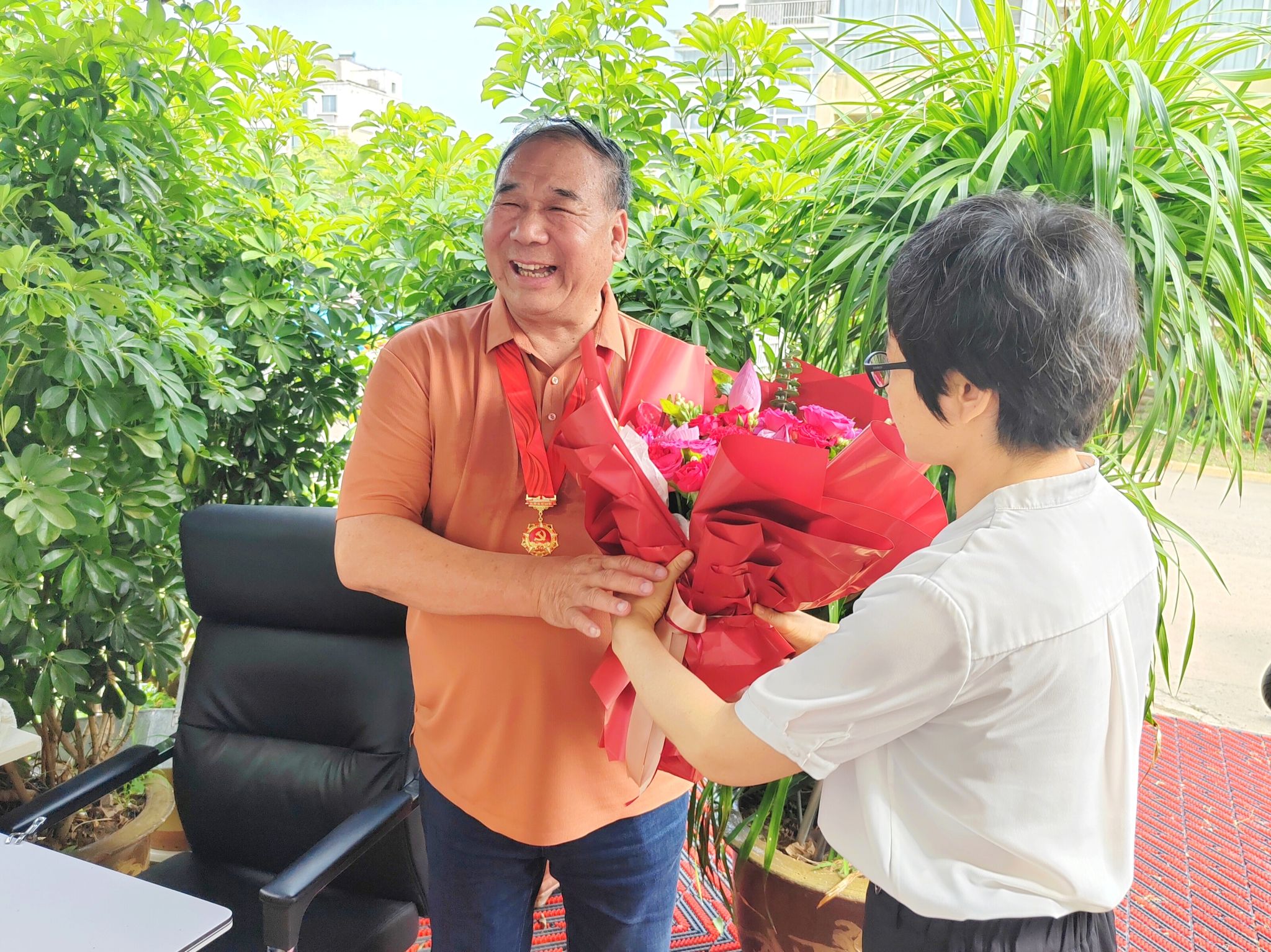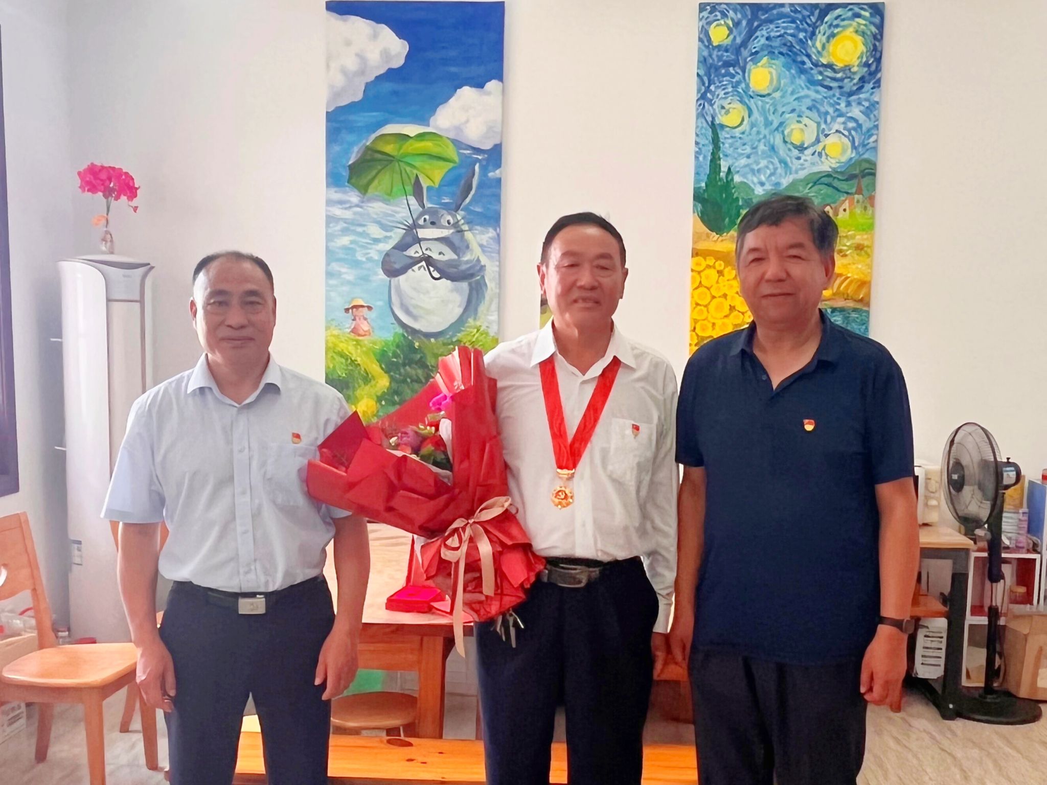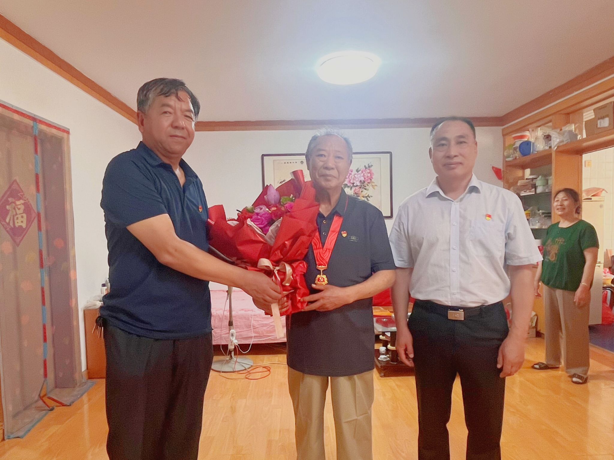 走访慰问期间,大家为老党员佩戴纪念章,送上鲜花和慰问品,向他们表示热烈的祝贺和亲切的问候,并通过他们向数十年如一日矢志不渝心向党的老党员们致以崇高的敬意,对他们长期以来关心支持学校事业发展和人才培养工作表示衷心的感谢。
