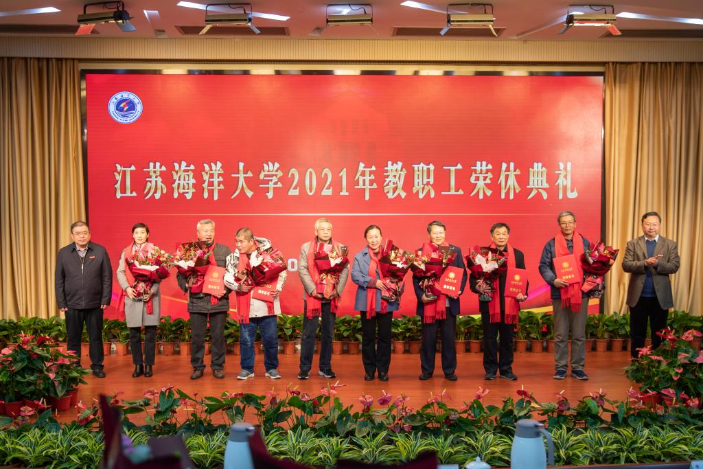 王自力、宁晓明为荣休教师代表颁发证书,送上鲜花,并合影留念。薪火相传,生生不息。一张张证书,一束束鲜花,承载着江苏海洋大学尊师重教的精神传承和饮水思源的情感传递,也承载着全校师生对荣休教职工的依依惜别与百般不舍。