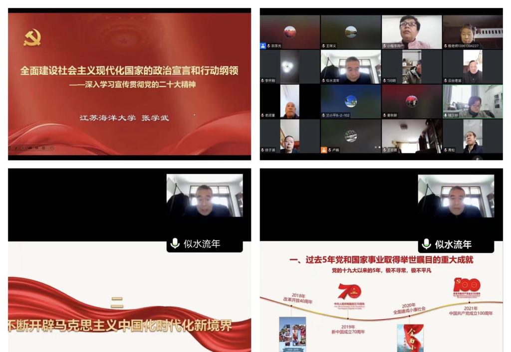 12月1日下午,离退休党工委举行理论学习中心组(扩大)专题学习辅导报告会,党的二十大精神宣讲团成员张学武同志应邀作“全面建设社会主义现代化国家的政治宣言和行动纲领”专题辅导报告。校党委第三巡学旁听工作组组长李梅英、成员卢娟全程参加旁听并现场指导。离退休党工委书记钱汉珍主持会议,离退休党工委委员、全体离退休党支部委员、在职党员及部分老党员代表共计50余人线上参加学习。