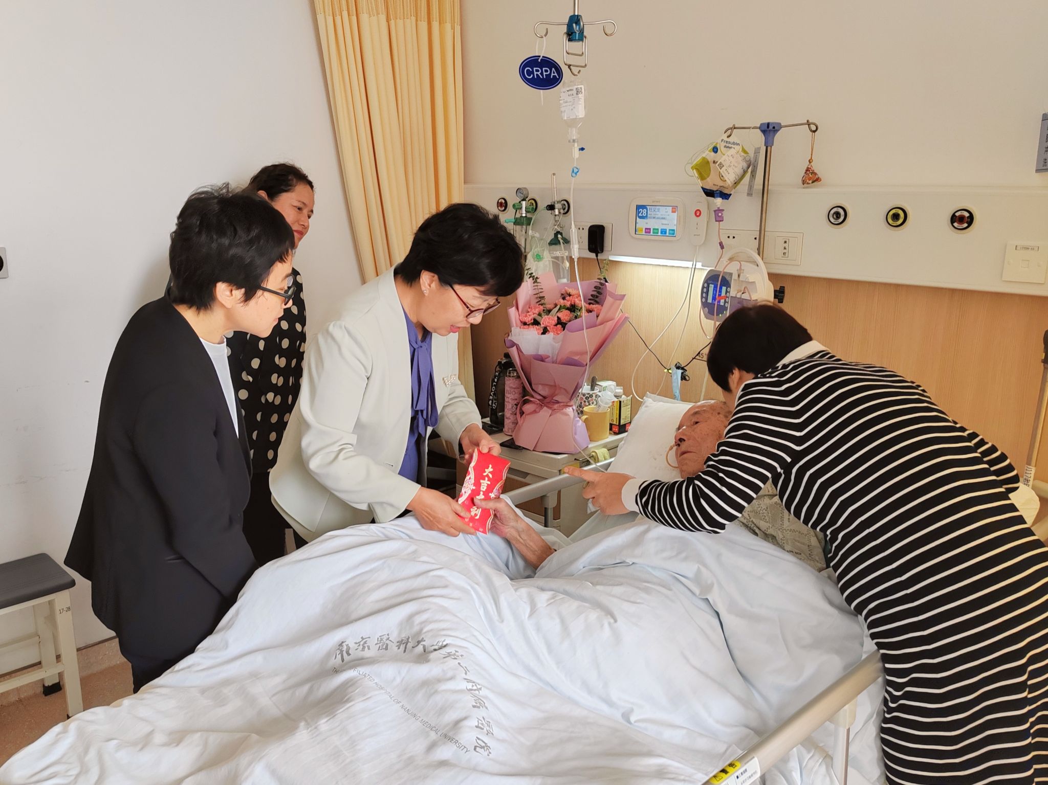 10月13-14日,校党委副书记李梅英带队奔赴南京、徐州,走访慰问了部分校级老领导。在南京医科大学附属医院,李梅英一行来到老校长杜义龙病榻前送上问候和良好祝愿,和其女儿亲切攀谈,仔细询问和关心他的身体状况;在江苏省老年公寓,看望原副校长陈华山及其夫人,陈老还兴致勃勃的带领大家参观了公寓的文化活动和生活场所;10月13日,是原校党委书记王佐国的90岁生日,李梅英一行到家中看望了王佐国及其夫人,并祝福他生日快乐、健康长寿。