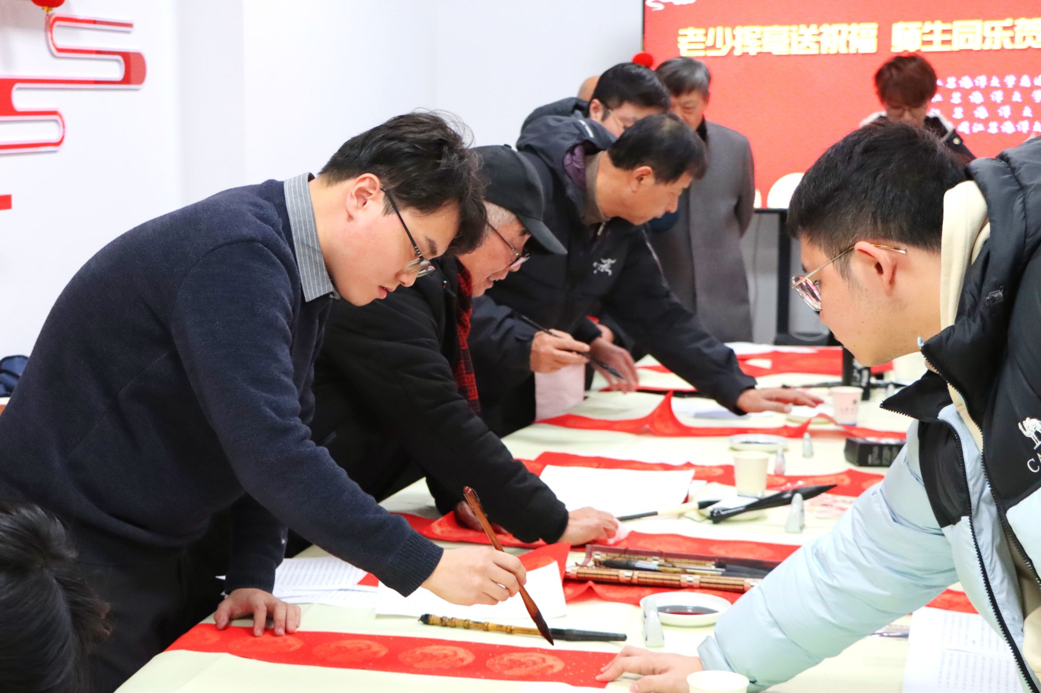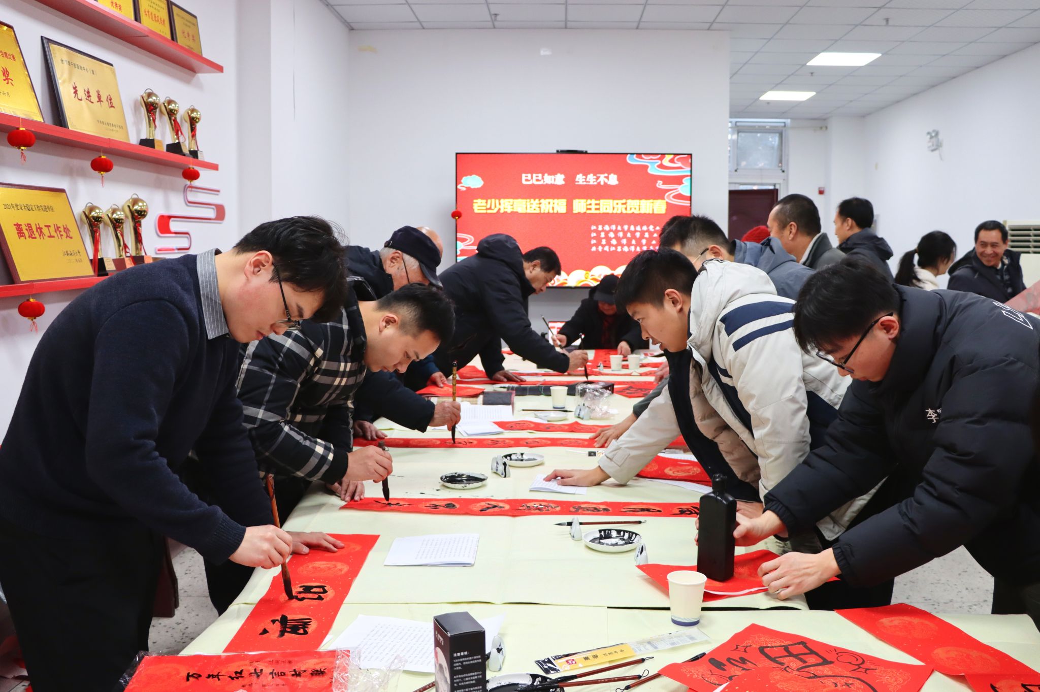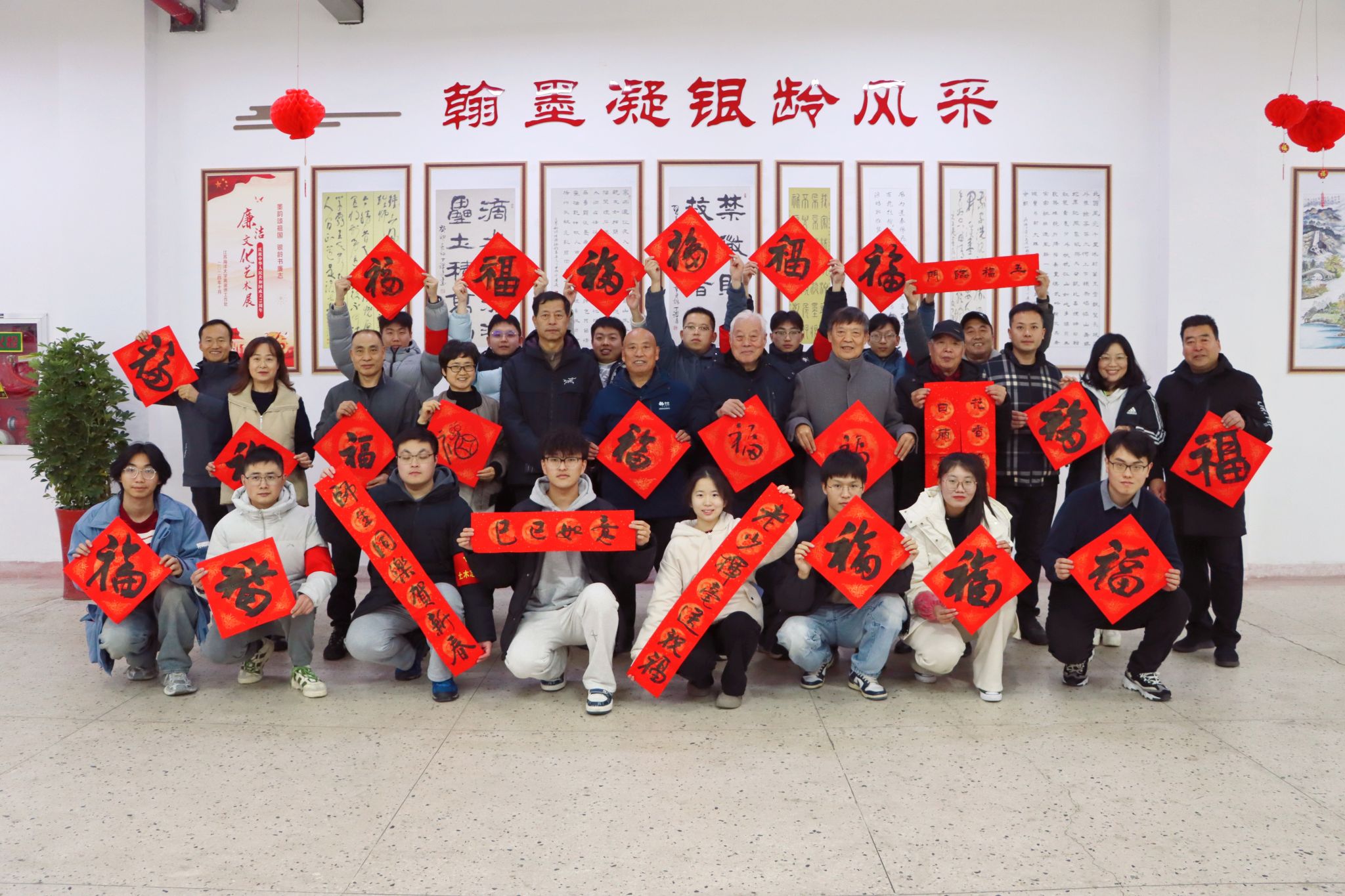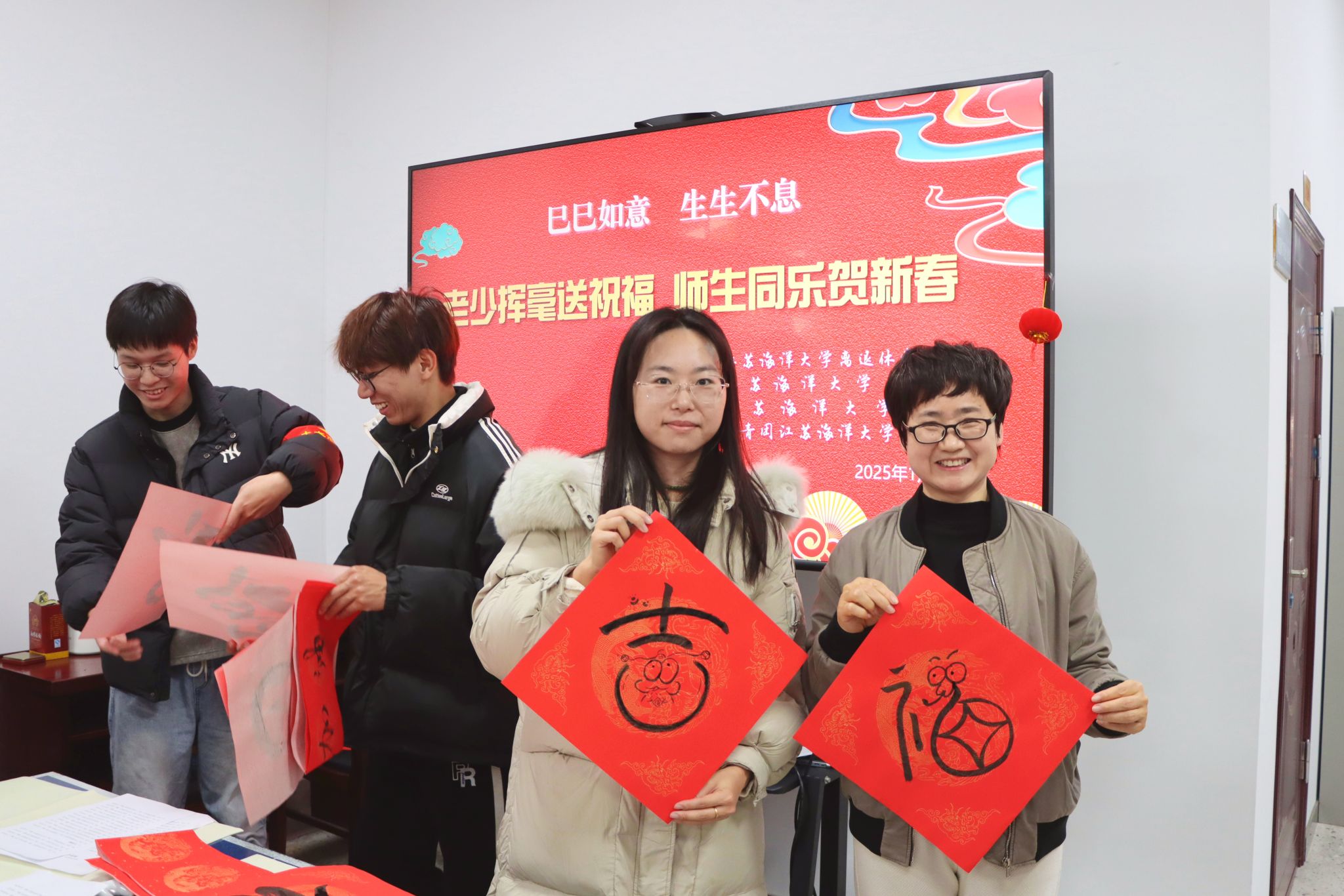1月3日下午,校离退休工作处、关工委、工会和团委在筑海楼一楼联合举行“送福迎春”师生写春联活动。离退休老教师董立业、丁耀进、于建春、吴琼以及校团委副书记王衍、商学院辅导员曹轶文等10余位师生志愿者来到现场,义务为全校师生写春联、送“福”字,共同迎接2025年新春佳节的到来。
