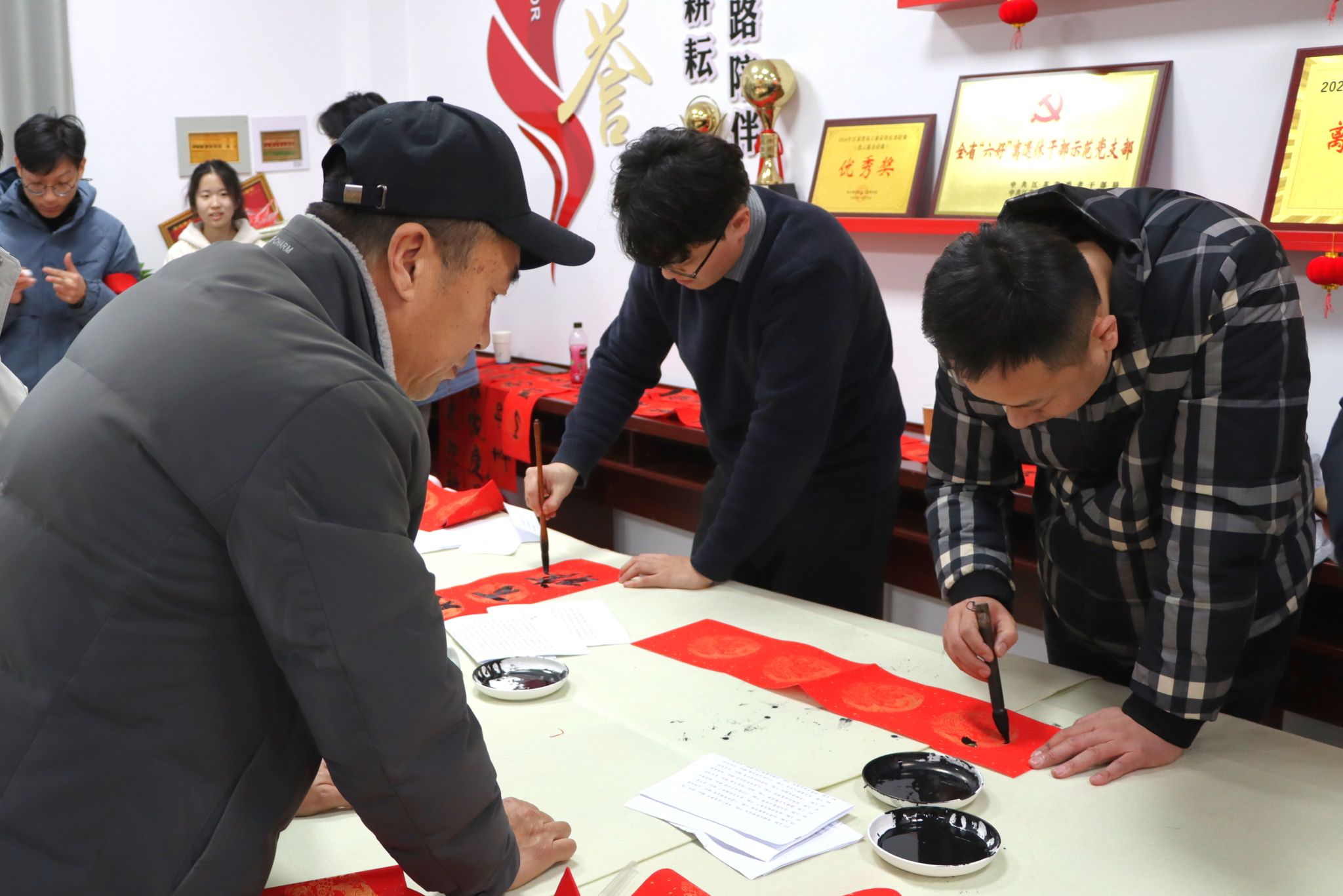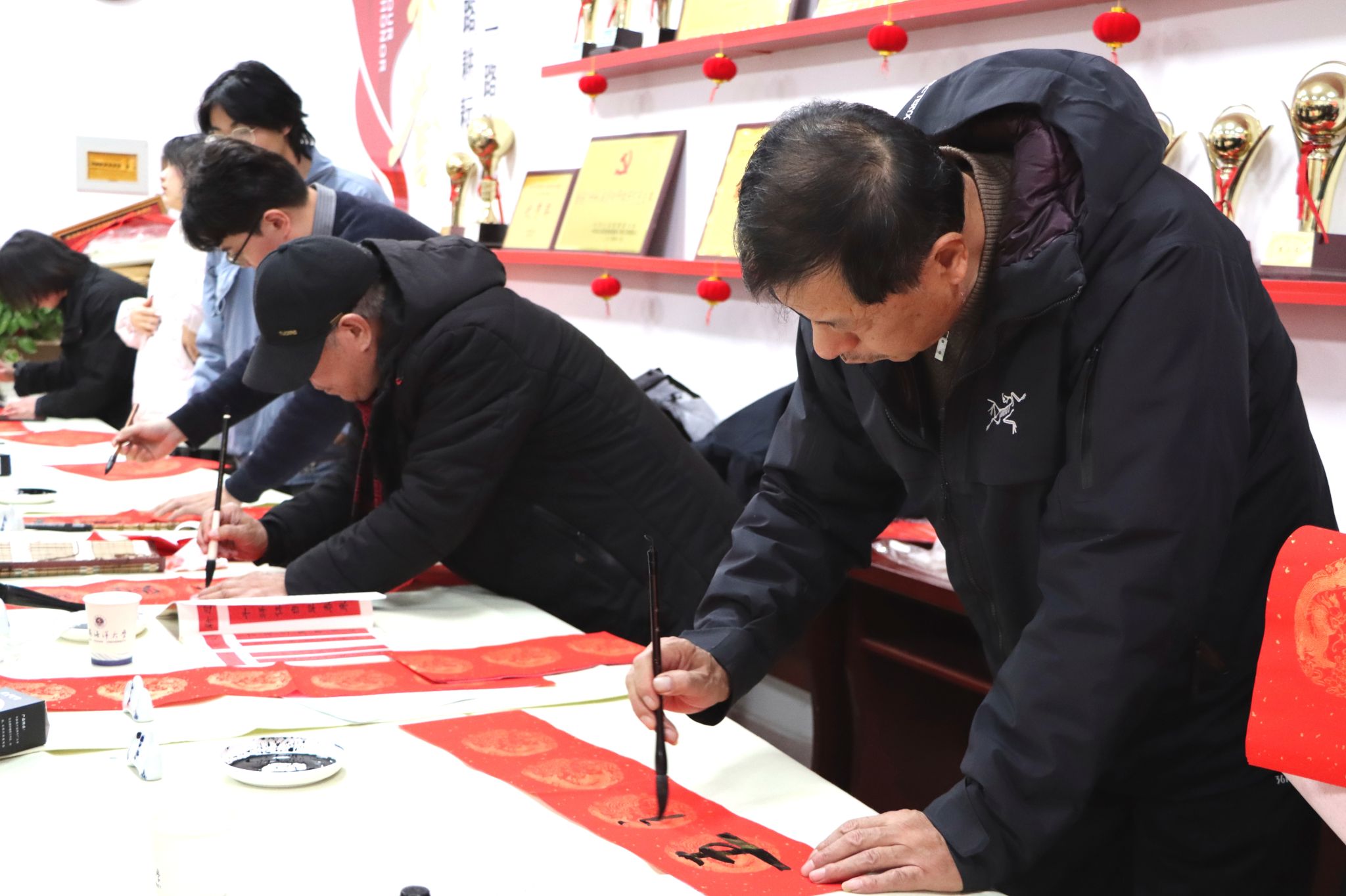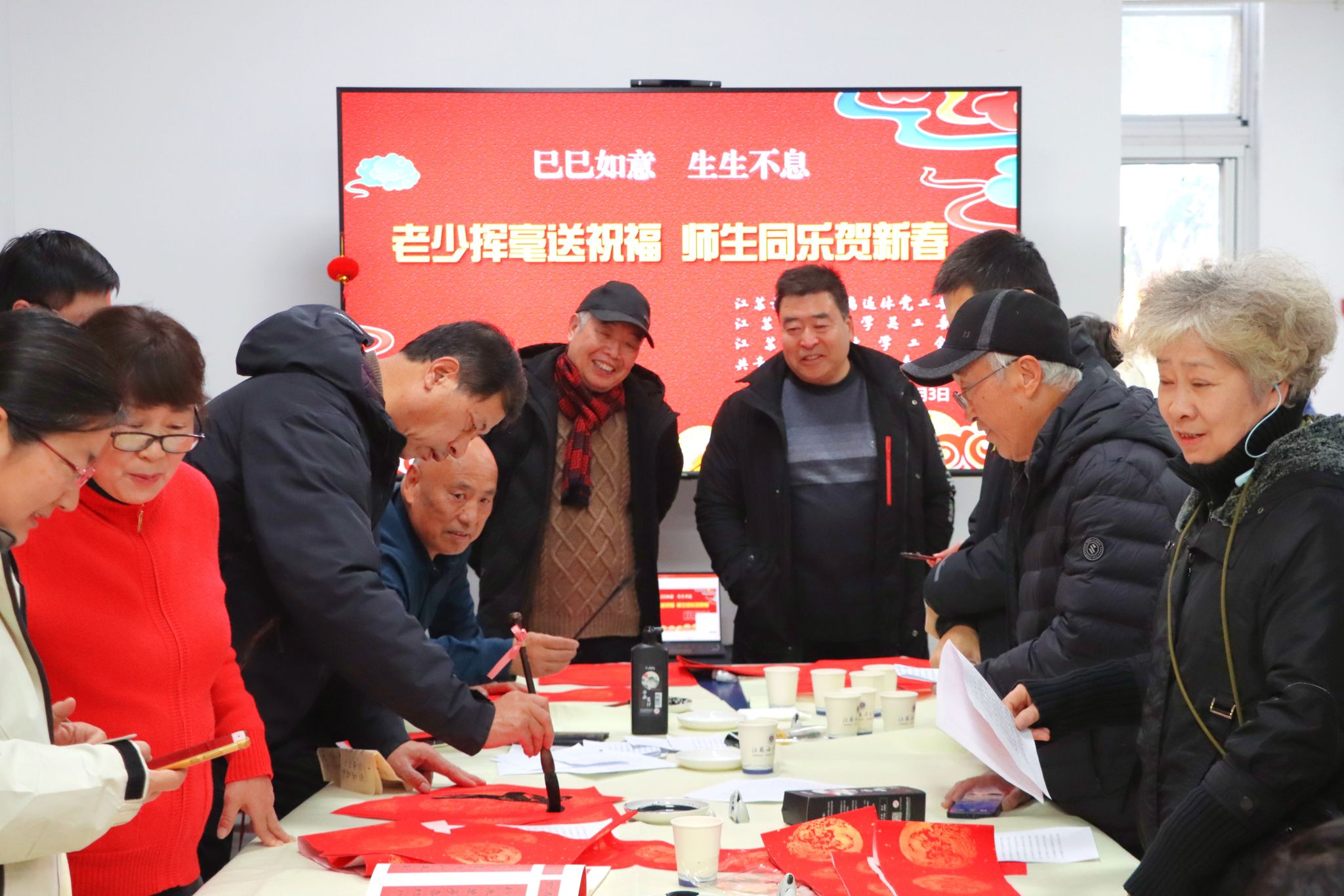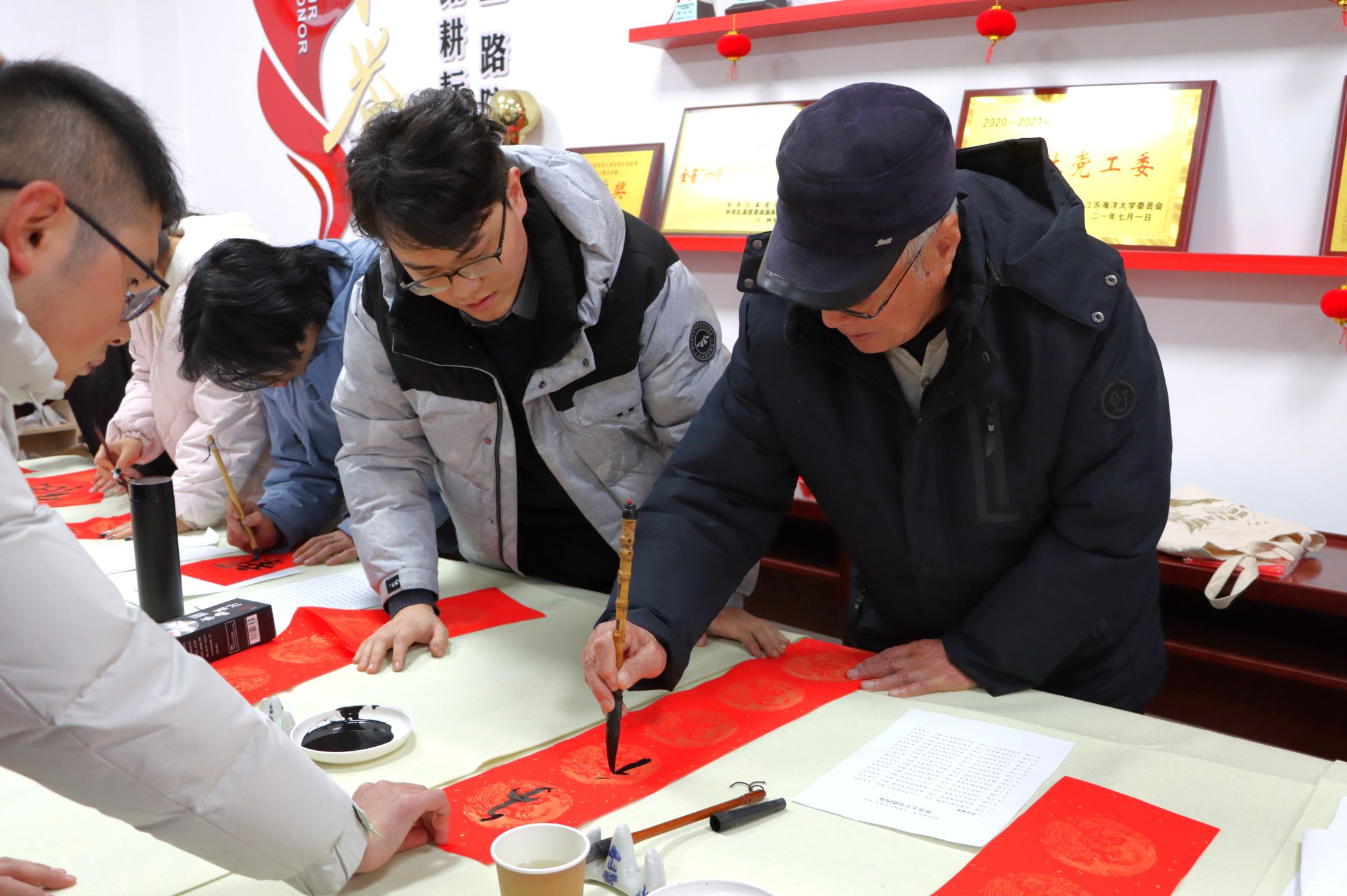 1月3日下午,校离退休工作处、关工委、工会和团委在筑海楼一楼联合举行“送福迎春”师生写春联活动。离退休老教师董立业、丁耀进、于建春、吴琼以及校团委副书记王衍、商学院辅导员曹轶文等10余位师生志愿者来到现场,义务为全校师生写春联、送“福”字,共同迎接2025年新春佳节的到来。