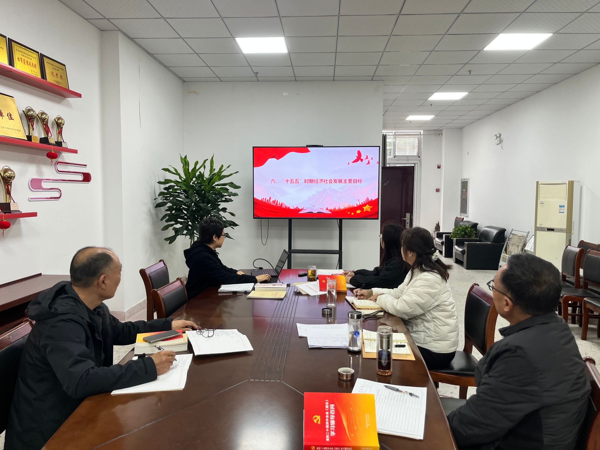 11月17日下午,离退休党委理论学习中心组召开(扩大)会议,专题学习党的二十届四中全会精神,党委书记钱汉珍主持学习会,党委委员、离退处全体在职人员参加学习。